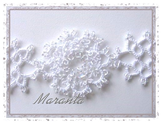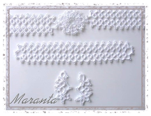 | Frywolitka (frivolite, tatting, occhi, chiacchierino, nupereller, タティングレース )- to rodzaj koronki artystycznej (nazywanej inaczej koronką czółenkową) wykonywanej z cienkiej nici (bawełnianej, jedwabnej, poliestrowej) za pomocą specjalnych czółenek lub igły i szydełka. Dzięki użyciu cienkiej nici, całość wygląda bardzo delikatnie (i to prawdopodobnie wyjaśnia pochodzenie nazwy tej koronki - od łacińskiego frywolus - delikatny, kruchy), choć równocześnie jest niezwykle trwała (znacznie trwalsza niż porównywalna koronka szydełkowa). [źródło: Wikipedia] |