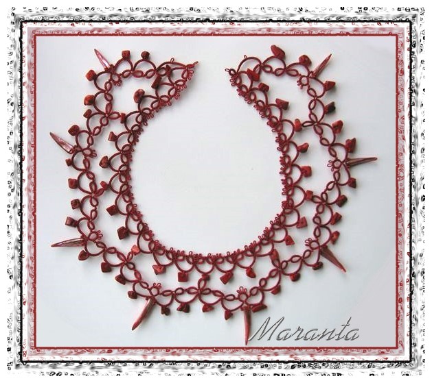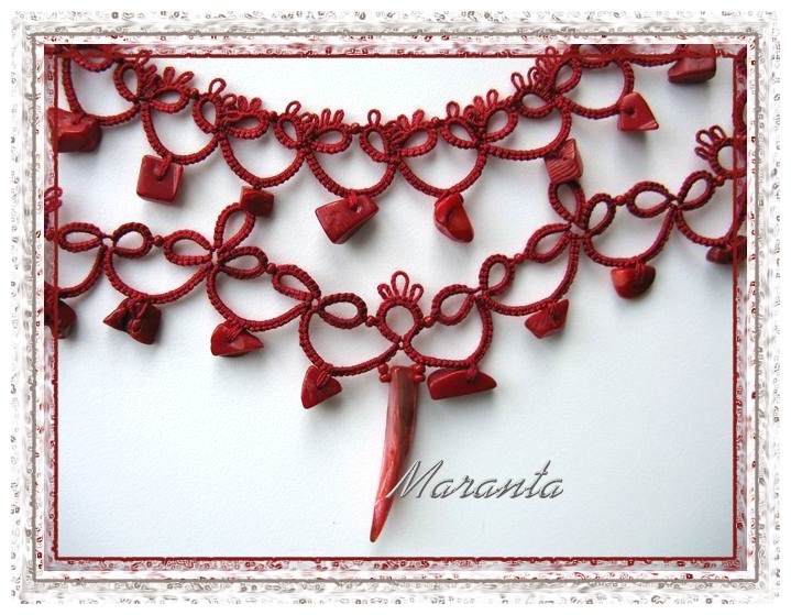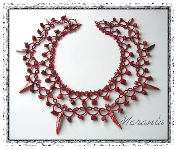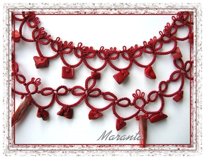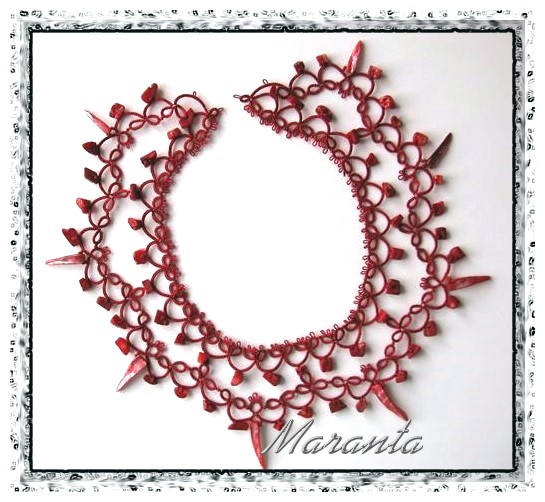 | Frywolitka (frivolite, tatting, occhi, chiacchierino, nupereller, タティングレース )- to rodzaj koronki artystycznej (nazywanej inaczej koronką czółenkową) wykonywanej z cienkiej nici (bawełnianej, jedwabnej, poliestrowej) za pomocą specjalnych czółenek lub igły i szydełka. Dzięki użyciu cienkiej nici, całość wygląda bardzo delikatnie (i to prawdopodobnie wyjaśnia pochodzenie nazwy tej koronki - od łacińskiego frywolus - delikatny, kruchy), choć równocześnie jest niezwykle trwała (znacznie trwalsza niż porównywalna koronka szydełkowa). [źródło: Wikipedia] |