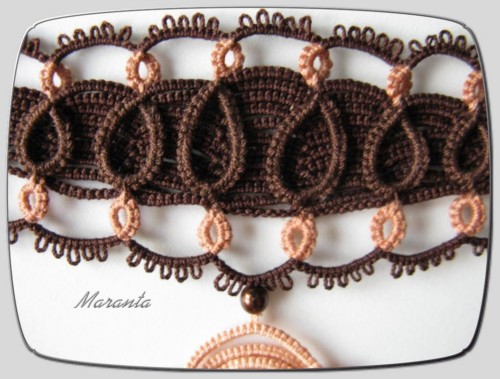 | Frywolitka (frivolite, tatting, occhi, chiacchierino, nupereller, タティングレース )- to rodzaj koronki artystycznej (nazywanej inaczej koronką czółenkową) wykonywanej z cienkiej nici (bawełnianej, jedwabnej, poliestrowej) za pomocą specjalnych czółenek lub igły i szydełka. Dzięki użyciu cienkiej nici, całość wygląda bardzo delikatnie (i to prawdopodobnie wyjaśnia pochodzenie nazwy tej koronki - od łacińskiego frywolus - delikatny, kruchy), choć równocześnie jest niezwykle trwała (znacznie trwalsza niż porównywalna koronka szydełkowa). [źródło: Wikipedia] |