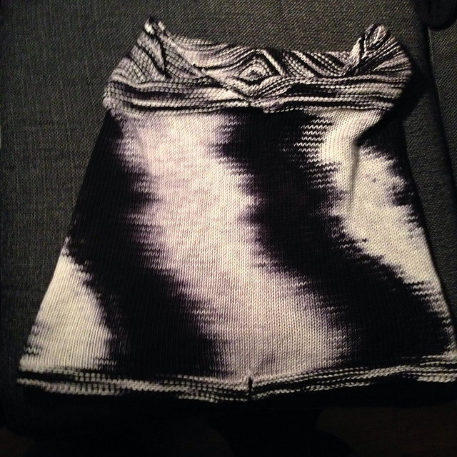 AlaJ owszem było zdjęcie, ale ścieg na próbce dżersej, więc siłą faktu są poziome pasy. Zatem widziały gały co brały. Kolory mi się spodobały i z cichą nadzieją, pomyślałam, że może ktoś widział, może ktoś wie. Lubię różnorodność w dzierganiu.